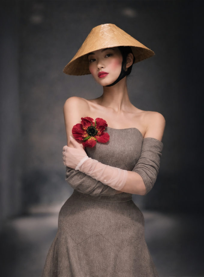 COUTURE CORSET DRESS WITH HAND-PAINTED SILK FLOWER
